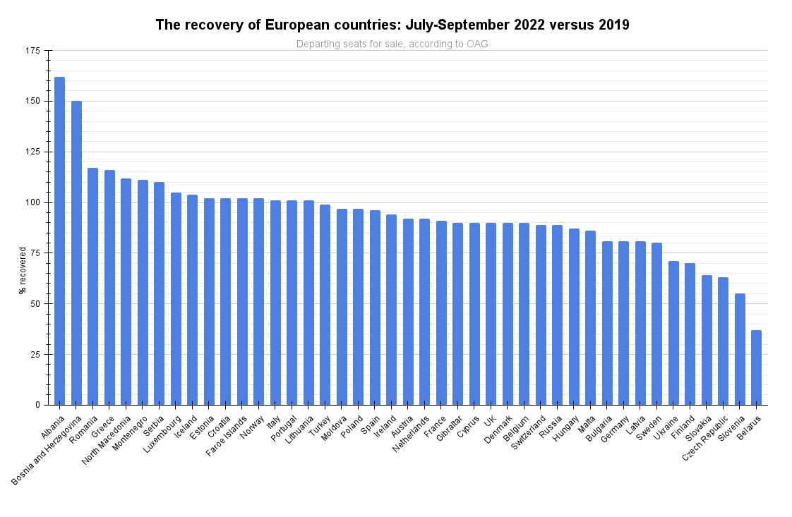Në vendin e parë të top dhjetëshes me performancën më të keqe është Bjellorusia, aspak surprizuese, me kapacitet të shfrytëzuar vetëm 37%. Përfshirja e Ukrainës është për fat të keq optimiste, duke qenë se lufta nuk duket të ketë një fund. Shumë linja ajrore planifikojnë fluturime në Ukrainë në tremujorin e tretë, por ato ndoshta do të hiqen.