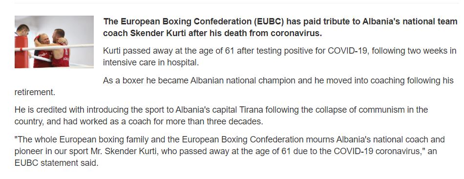 Konfederata Europiane e Boksit (EUBC) ka nderuar kujtimin e trajnerit të ekipit kombëtar të boksit, Skënder Kurti, i cili edhe pse në një moshë të re dhe i mësuar me sportin, koronavirusi i mori jetën.