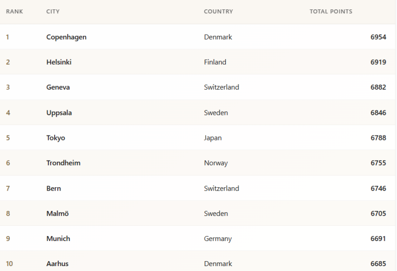 Në 10-shen kryesore ndodhen nga dy qytete të Danimarkës, Suedisë dhe Zvicrës. Përveç Tokios që zë vendin e pestë, ky grup dominohet nga Helsinki, Gjeneva dhe Uppsala në Suedi, pastaj Trondheim në Norvegji, kryeqyteti zviceran Bern, Malmo, Mynihu, Aarhus (Danimarkë) dhe Zyrihu në vendin e 11-të.