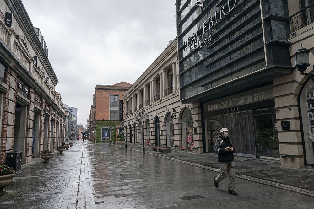 Një qytetar me maskë duke kaluar në një zonë tregtare të Wuhanit të Kinës