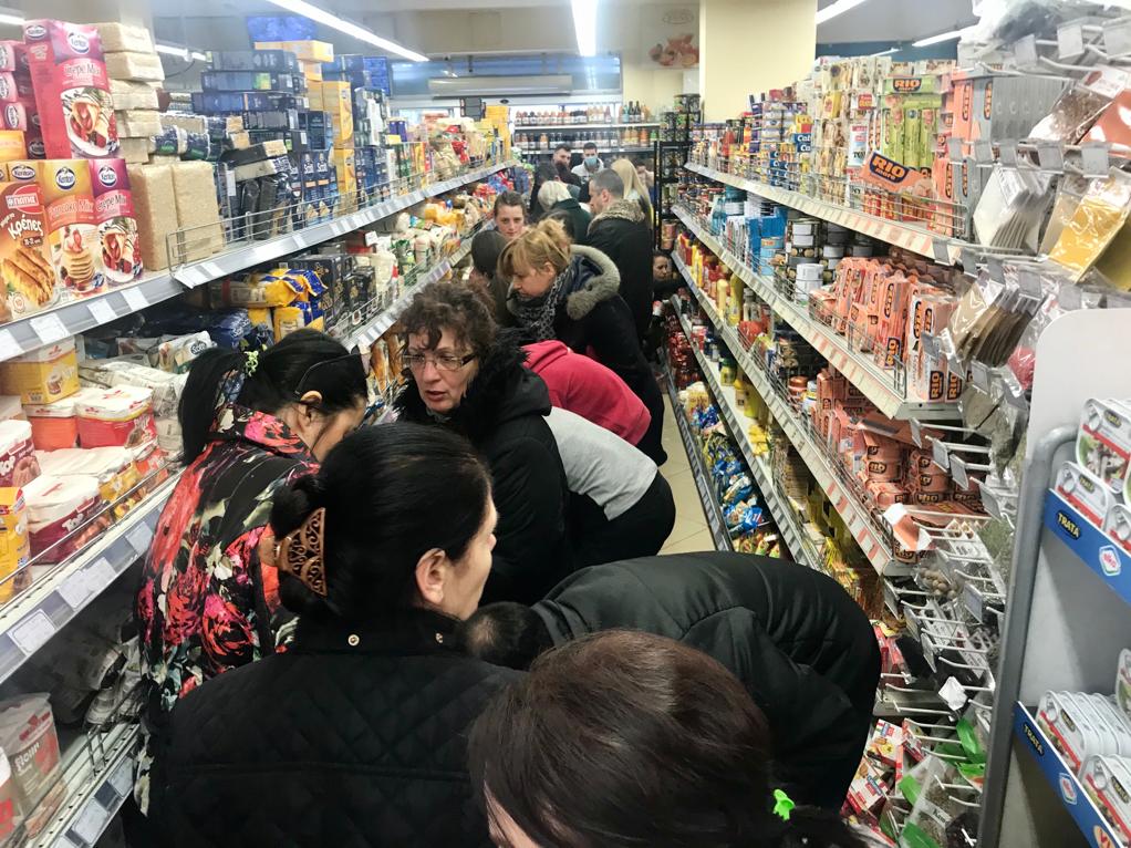 Një ndër masat është sigurimi i ushqimit dhe në këtë foto të siguruara nga Gazeta “Si”, shihen njerëzit nëpër supermarkete, ndryshe nga ditët e zakonshme. Kjo duket si një “nxitje” e parë për të përballuar një rrezik të mundshëm.