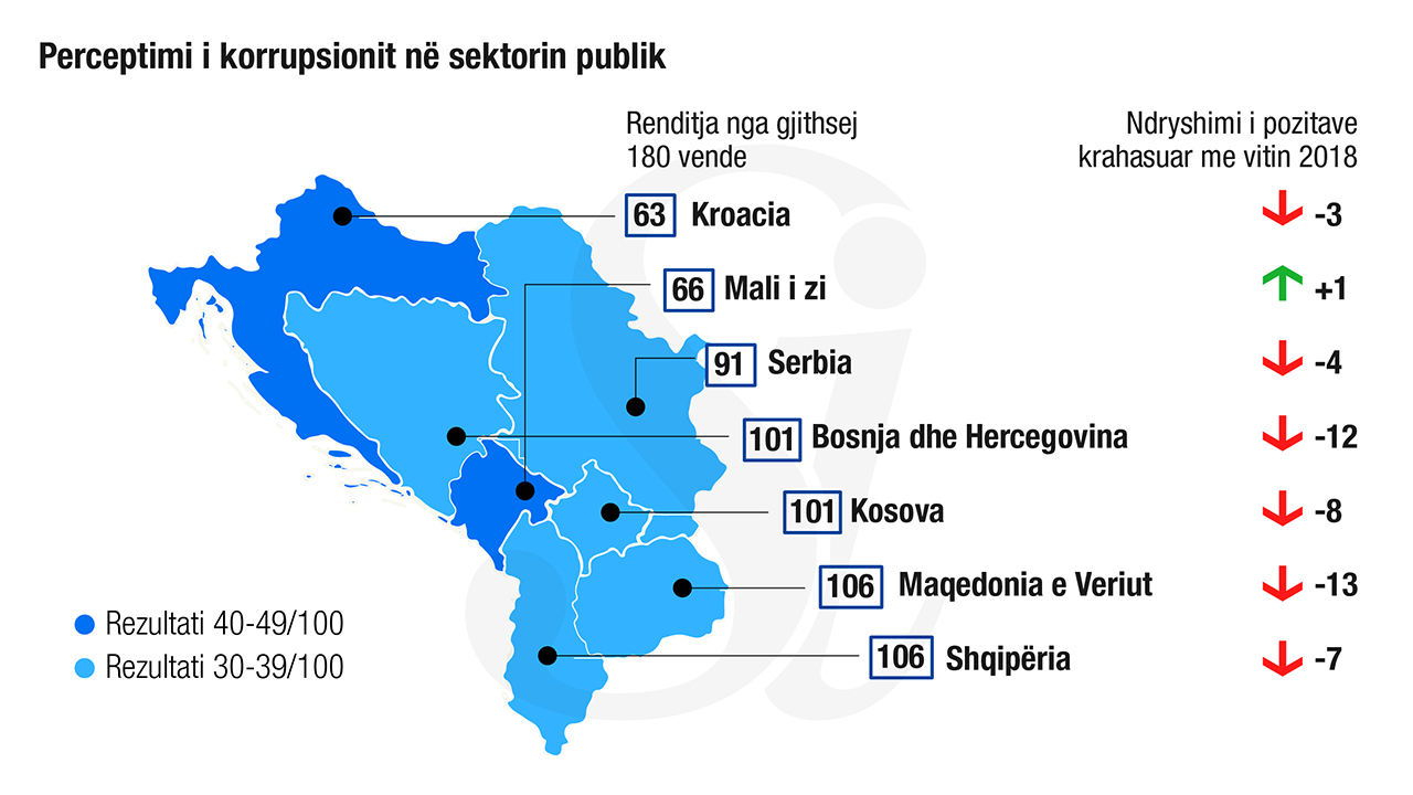 Shqipëria është e renditur në vendin e 106-të, duke zbritur shtatë shkallë. Një rezultat që shënon një përkeqësim në indeksin e luftës kundër korrupsionit. Shqipëria është e fundit në rajonin e Ballkani, ku edhe Bosnje-Hercegovina është më lart.  Kosova, në indeksin e sivjetshëm, radhitet e 101-ta me 36 pikë. Ky rezultat do të thotë se ka shënuar përkeqësim në luftën kundër korrupsionit krahasuar me vitin e mëparshëm, kur ka qenë në vendin e 93-të, me 37 pikë. Nga vendet e rajonit të Ballkanit Perëndimor, përmirësim të lehtë në luftën kundër korrupsionit ka shënuar vetëm Mali i Zi. Në indeksin e këtij viti të organizatës Transparency International, ky vend radhitet në vend të 66, krahasuar me pozitën 67 që ka pasur një vit më parë. Bosnje dhe Hercegovina sivjet radhitet në të njëjtën pozitë si Kosova, 101, ndërsa vitin e kaluar ka qenë e 89-ta. Serbia ka rënë nga vendi 87 në 91.
