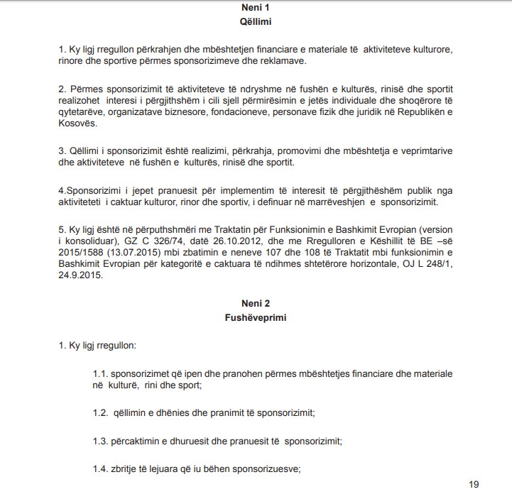 Nëse në Shqipëri ka disa vite që diskutohet dhe bëhen takime e premtime për të miratuar një ligj të ri për sportin dhe sponorizmet në të, Kosova dje e ka miratuar në ligj të tillë. Me 73 vota pro dhe vetëm 2 abstenim, parlamenti i Kosovës e kaloi ligjin e ri për sponsorizmet që pritet t’i jap një hov të madh zhvillimit të sportit falë mbështetjes më të madhe që tashmë garantohet për bizneset. Ligji për sponsorizimin e sporteve ishte miratuar prej vitesh, por implementimi i tij nuk kishte ndodhur për shkak se binte ndesh me një tjetër ligj. Në amendamentin e ri të propozuar nga deputeti Bekim Haxhiu rregulloheshin këto përplasje dhe tashmë Kosova e ka një ligj të ri për sportin.  Me këtë ligj i hapet rrugë bizneseve që të investojnë në sport, dhe 30 për qind e fitimit në tatim mund ta ndajnë për sportin.