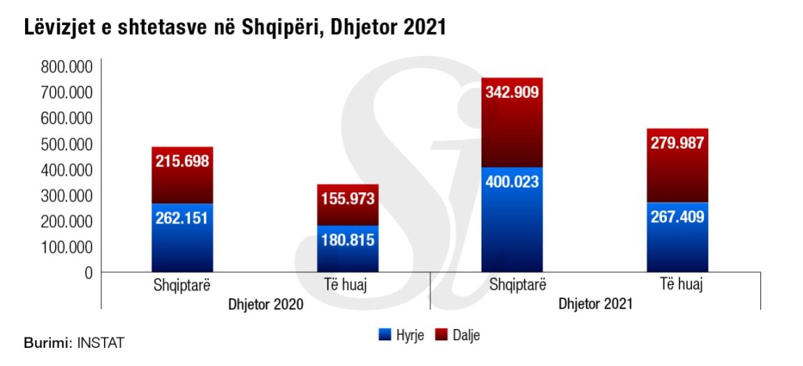 Numri i shtetasve shqiptarë të dalë nga Shqipëria në vitin 2021, është 4.19 mln, duke u rritur 44.2%, krahasuar me vitin 2020.