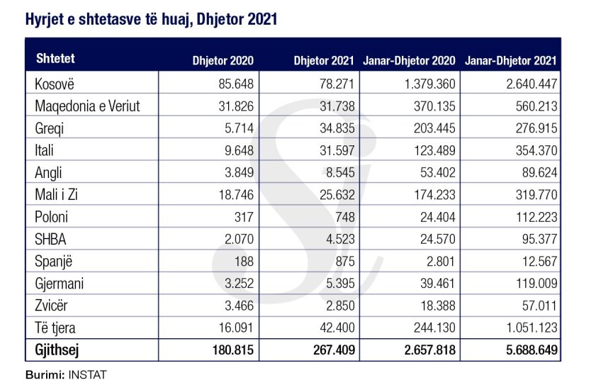 Vetëm për muajin dhjetor 2021, numri i hyrjeve të jashtme në Shqipëri është rritur me 50% nga 2020-a duke shkuar në 667.432 nga të cilët 267.409 kanë qenë të huaj dhe pjesa tjetër shqiptarë.