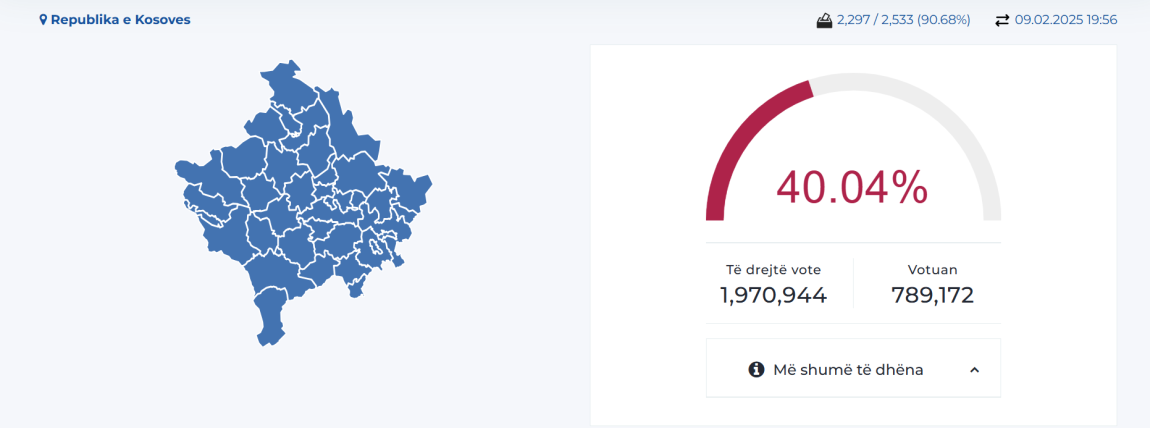 Komisioni Qendror i Zgjedhjeve të Kosovës njoftoi se, pas procesimit të mbi 90 për qind të votave, pjesëmarrja në zgjedhje ka qenë 40.04%. Siç ka bërë të ditur Valmir Elezi, zëdhënës i KQZ-së, në një konferencë për media në mbrëmje, të drejtën për të votuar e kanë shfrytëzuar mbi 789 mijë qytetarë.