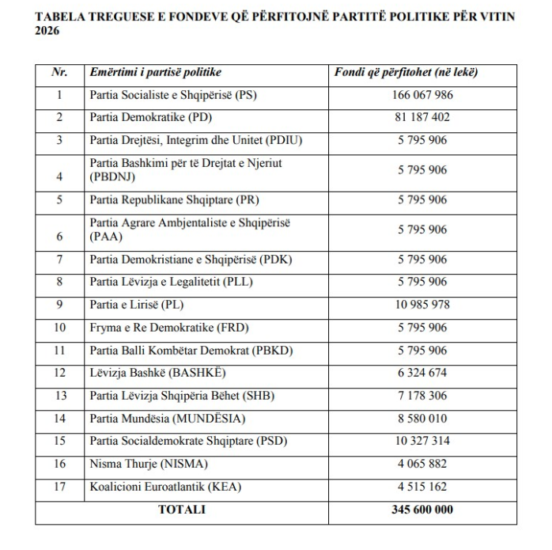 Sipas KQZ-së, gjithsej përfitojnë 17 parti, ndërsa ndarja bëhet sipas rezultateve të zgjedhjeve të 11 majit 2025. Partia Socialiste kryeson me 166,067,986 lekë, e ndjekur nga Partia Demokratike me 81,187,402 lekë.