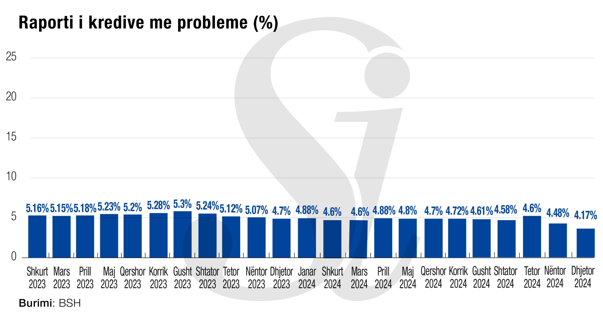 Nga të dhënat statistikore, tregohet se në fund të vitit 2024, kreditë me probleme ranë në 4.17% të stokut total të kredive. Në nëntor ky tregues ishte 4.48%, ndërsa një vit më parë ishte 4.74%.