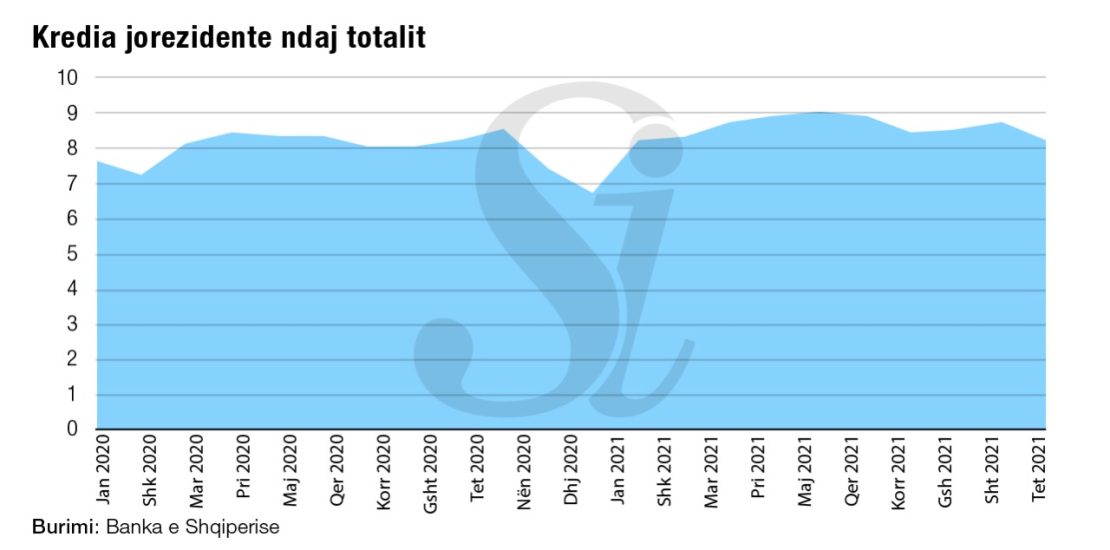 Sipas të dhënave të Bankës së Shqipërisë, kredia e dhënë për huamarrës jorezidentë në Shqipëri në fund të tetorit përbënte 8.3% të portofolit të kredisë duke shënuar kështu nivelin më të ulët që prej muajit janar të vitit 2021.