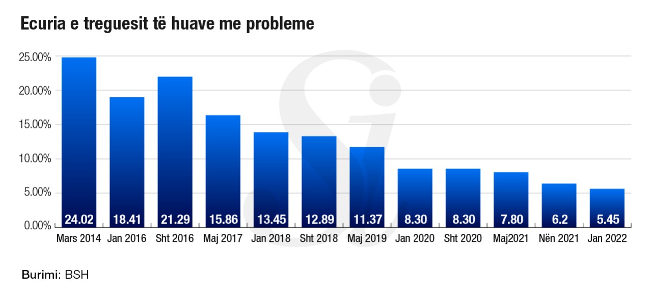 Kreditë me probleme arritën pikun në vitin 2016 me 25% me tendencë rritje edhe gjatë 2020-s, po në vitin 2021 nisi ulja e shpejtë e tyre. Më herët, BSH pati raportuar se përqindja më e madhe e kredimarrësve “të këqij” i përkiste bizneseve të mëdha.