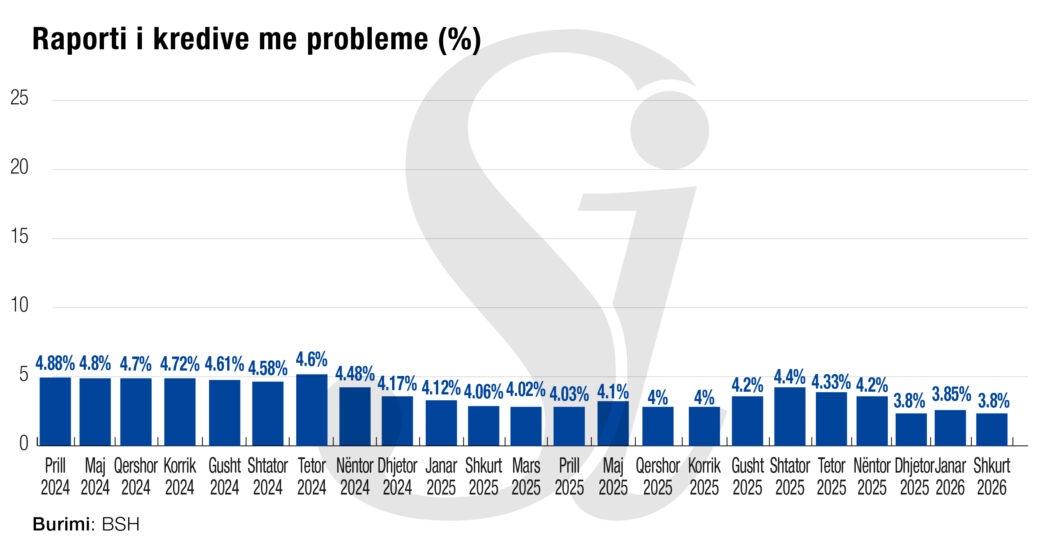 Nga Gazeta ‘SI’- Stoku i kredive me probleme në Shqipëri mbetet i qëndrueshëm në nivelin më të ulët historik. Në shkurt 2026, ky tregues zbriti në 3.8% të totalit të portofolit të kredisë, i pandryshuar krahasuar me muajt janar dhe dhjetor.