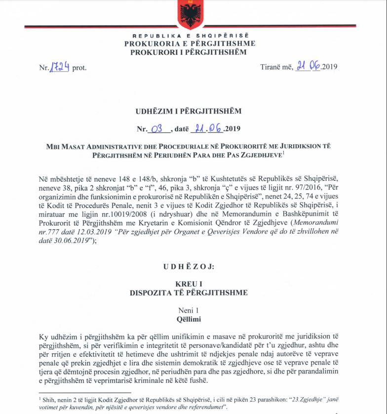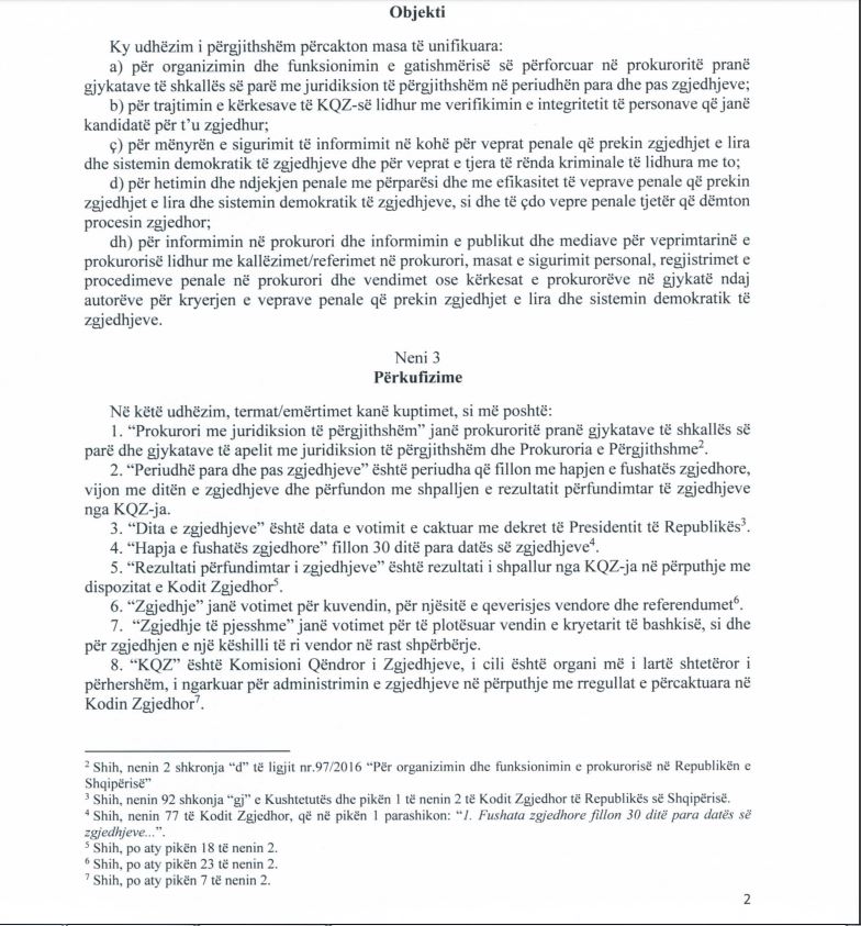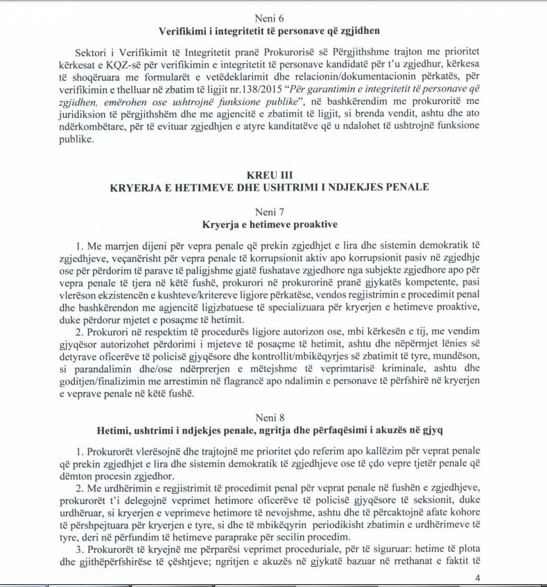Në udhëzimin e firmosur nga kryeprokurorja Marku thuhet se do të hetohen dhe ndiqen penalisht me përparësi dhe efikasitet të gjithë ata persona që prekin zgjedhjet e lira dhe sistemin demokratik të zgjedhjeve, si dhe kryejnë vepra penale që dëmtojnë procesin zgjedhor.