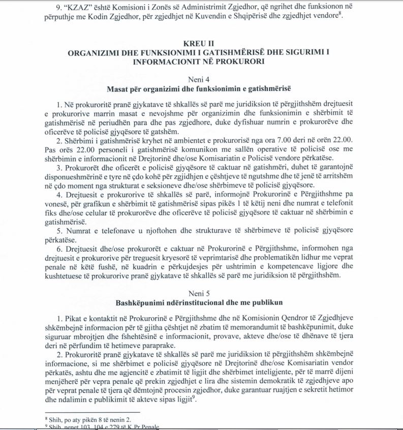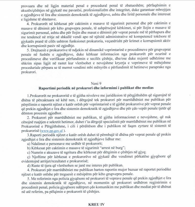 Në udhëzim ndër të tjera saktësohet se gjatë periudhës së zgjedhjeve, prokurorët do të jenë në gatishmëri nga ora 07:00 deri në 22:00 dhe do të kenë komunikim të vazhdueshëm me sallën operative të policisë.