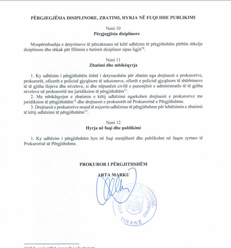 Prokurorja e Përgjithshme e Përkohshme, Arta Marku ka firmosur sot urdhrin për prokurorët, për masat administrative dhe proceduriale për periudhën para dhe pas zgjedhjeve.