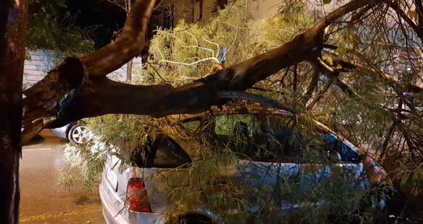 Ndërkohë, në një nga rrugët pas Fakultetit të Drejtësisë të Universitetit të Tiranës, një pemë është dëmtuar nga furtuna dhe ka rënë mbi një automjet të parkuar anës rrugës.