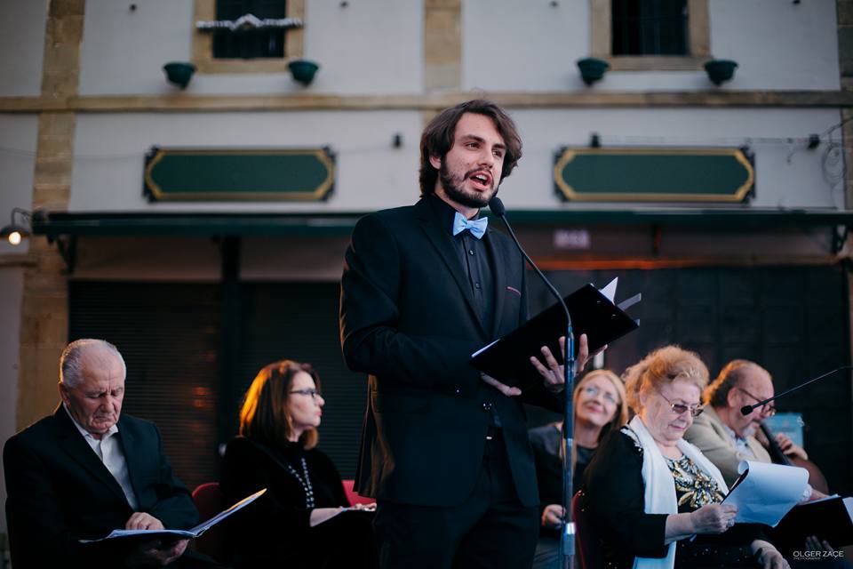 Dy aktorët në dy figura elegante veshur në kostume të errët që rrinë në dy anët e skenës si të ishin sy skajet e lojës së mendjes –humbnin formë e shkriheshin te secili burrë i ulur në sallën e katedrales Ortodokse, që përpiqeshin të ndreqnin gabimin e një vjetër me një të ri, si rritje, dalje nga vetmja, dëfrim…Edhe këtë poemë do ta çonte në Korçë.