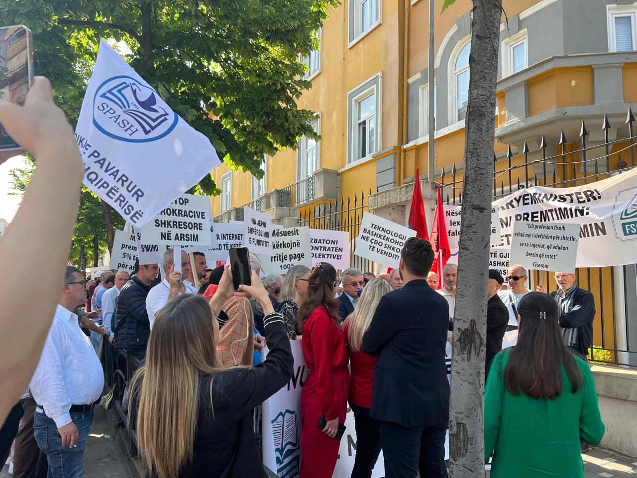 Mësuesit, anëtar të sindikatave u shkëmbyen pak poshtë Ministrisë së Arsimit, ku vazhduan të ecnin edhe pa e përshëndetur njëri-tjetrin, me pankarta në duar që shkruanin të njëjtat kërkesa: Dinjitet, pagë më të mirë, teknologji në çdo shkollë, rishikim të teksteve shkollore etj.