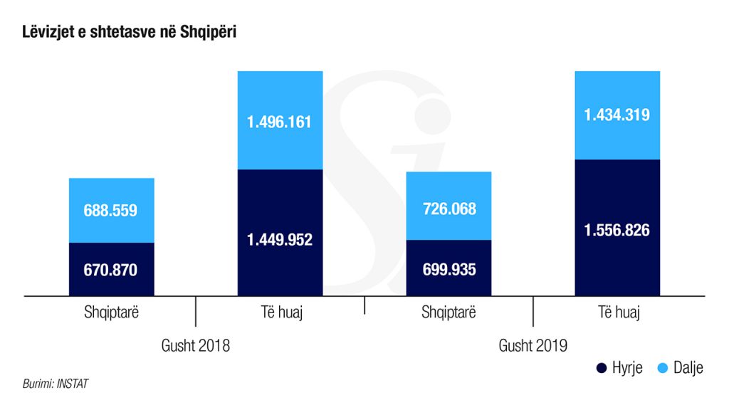 Daljet e shtetasve shqiptarë nga territori i Shqipërisë, gjatë muajit Gusht 2019, janë 726 mijë. Krahasuar me Gushtin e 2018-ës, ky numër është rritur 5,4 përqind