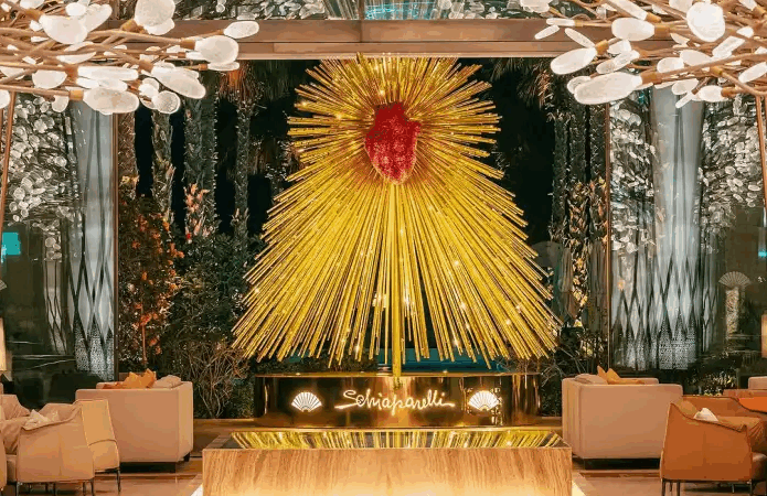 Është një deklaratë artistike që feston kryqëzimin e modës së lartë, bizhuterive të bukura dhe shpirtit festiv. Drita që reflektohet nga kristalet Swarovski krijon një lojë hipnotike reflektimesh, ndërsa eleganca e dizajnit Schiaparelli e transformon hapësirën në një mjedis ëndërrimtar, në përputhje të përkryer me luksin karakteristik të Dubait.