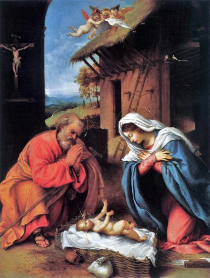 Në 1523 Lotto pikturoi “Lindja e Krishtit”, një panel i vogël (46 x 36 cm) i mbajtur në Galerinë Kombëtare të Arteve në Uashington. Lorenzo Lotto në këtë periudhë ishte gati të përfundonte qëndrimin e tij në Bergamo, një periudhë që përfshin vitet midis 1512 dhe 1525, e cila karakterizohet nga një “misticizëm afektiv” dhe një sens magjik i futur në vepra falë përdorimit të dritës. Lindja e Krishtit, e destinuar për një shtëpi private, duke pasur parasysh madhësinë e saj të vogël, është një pikturë e krijuar për përkushtimin e një familjeje. Në pikturë, personazhet e shenjtë janë vendosur në plan të parë, aq sa e vendosin vëzhguesin në një pozicion të privilegjuar. Ne nuk shikojmë brenda nga jashtë, skena shihet nga brenda; ekziston një kusht i afërsisë së besimtarëve me misterin që zbulohet.