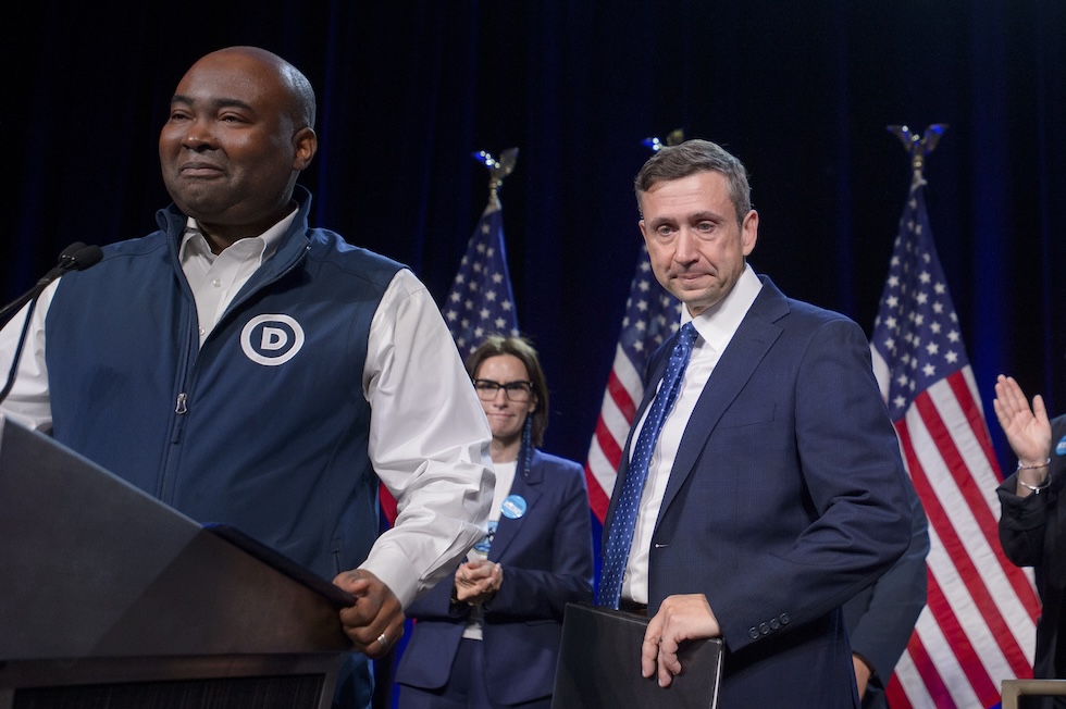 Udhëheqësit e vjetër dhe të rinj të Komitetit Kombëtar Demokrat, Jamie Harrison (majtas) dhe Ken Martin
