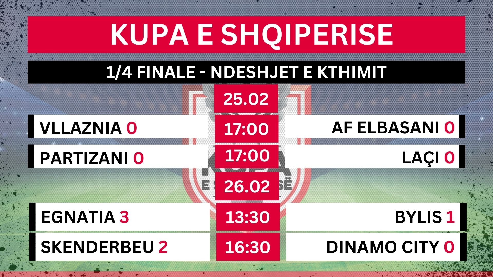 Nuk ka pushim për skuadrat në vend, të paktën ato që janë ende në garë për të fituar Kupën e Shqipërisë në sezonin 2024-2025. ¼ finalistet kthehen në fushë sot dhe nesër për një vend në raundin tjetër. Dy ndeshjet e sotme nuk prodhuan asnjë gol në sfidat e para dhe kjo e bën gjithçka të hapur pasditen e të martës. Duke filluar nga ora 17:00, në Shkodër dhe në Tiranë, Vllaznia do të luajë ndaj AF Elbasanit dhe Partizani pret Laçin. Në “Loro Boriçi” do të zhvillohet përballja e dytë në 4 ditë pas barazimit në Superiore.