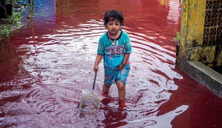 Një vajzë ecën nëpër një rrugë të përmbytur ku shihet uji i kuq i cili është bërë i tillë për shkak të mbetjeve të bojës nga fabrikat e rrobave, në Pekalongan, Indonezi.\Reuters