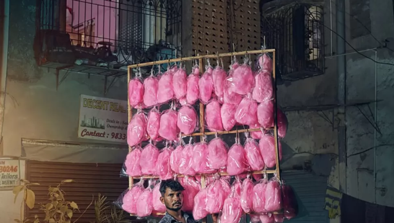 Fotografia është bërë në rrugët e Mumbait dhe është pjesë e një serie më të gjerë imazhesh të shitësve që shfaqin ushqime në mënyra të ndryshme me shpresën për të tërhequr një blerës.