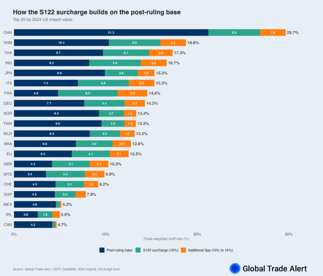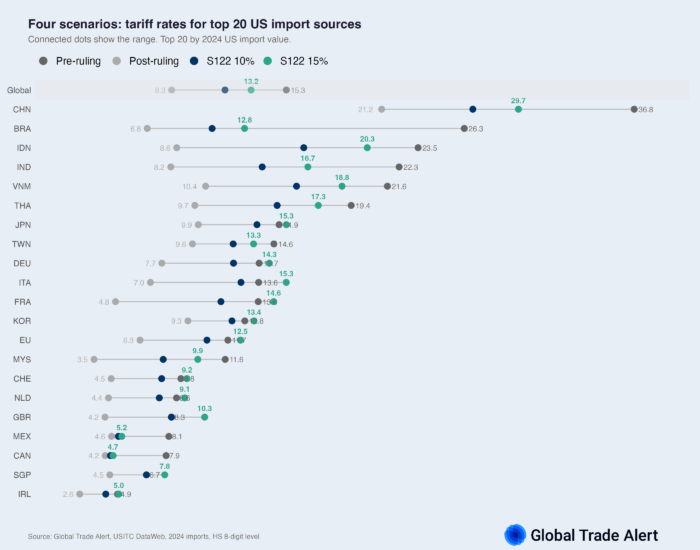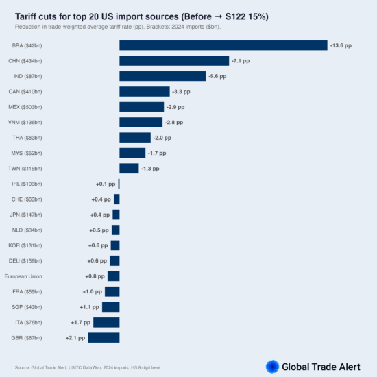Sipas llogaritjeve nga “Global Trade Alert”, një organizatë e pavarur që monitoron ndryshimet në tregti dhe politikat që ndikojnë në të, siç qëndrojnë gjërat tani – domethënë, me tarifa prej 10 përqind – 20 partnerët më të mëdhenj tregtarë të Shteteve të Bashkuara fitojnë të gjithë, me përjashtim të Mbretërisë së Bashkuar dhe Singaporit, të cilët nuk do të ndryshonin pasi ata tashmë përballen me tarifa prej 10 përqind.
