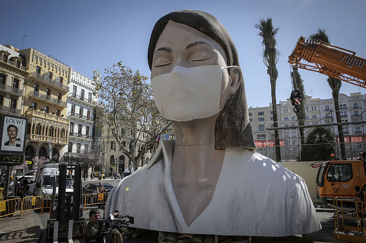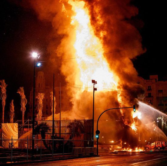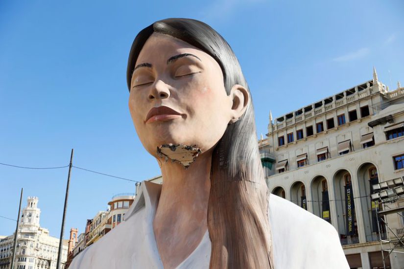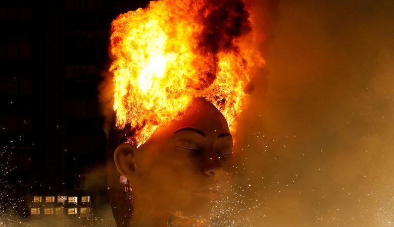 Djegia e monumentit “La Meditadora”, gjatë përfundimit të festivalit Fallas një festë tradicionale që mbahet çdo vit në përkujtim të Shën Jozefit në qytetin e Valencias, Spanjë. Festivali u shty deri në shtator për shkak të kufizimeve në vend për shkak të Covid-19. Artistët José Ramón Espuig dhe Manolo Martín, krijuesit e skulpturës së madh vendosën që këtë herë mos t’i vendosnin një maskë në fytyrë. Nga fotografia Eva Manez Lopez/Reuters/