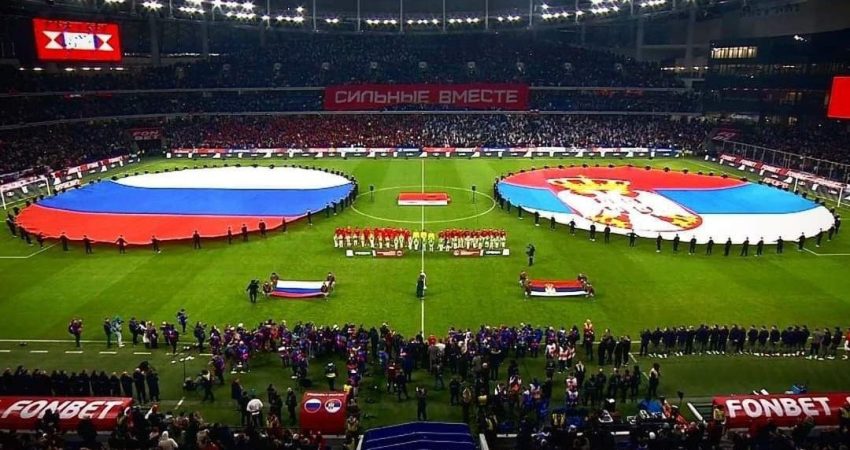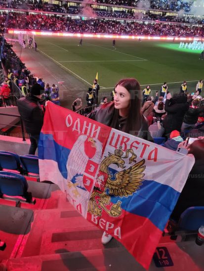 Të tjerë tifozë përdorën parrullat: “Rusia dhe Serbia janë vëllezër përgjithmonë!” Edhe ata që qëndruan të heshtur valëvitën me krenari flamujt rus dhe serb së bashku, gjë që vë në dukje se rusët dhe serbët kanë “një ngjyrë-një besim”.