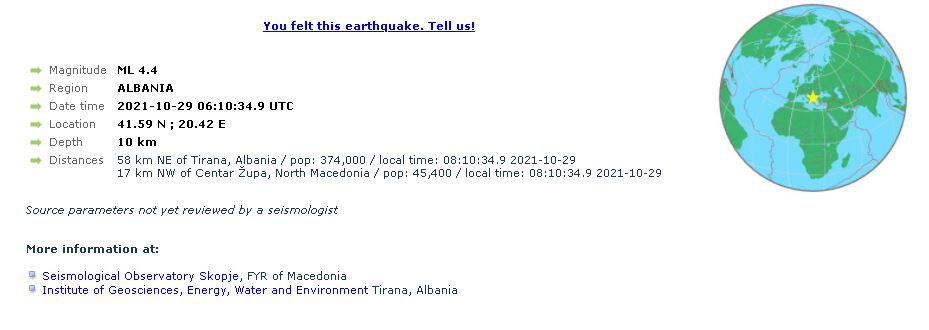 Disa minuta më vonë në të njëjtën epiqendër dhe me një thellësi prej 10 kilometrash është regjistruar një tërmet tjetër, me magnitudë 4.4 të shkallës Rihter.
