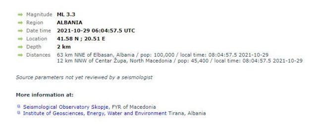 Dridhjet e tokë ishin me një magnitudë prej 3.3 të shkallës Rihter. Epiqendra e tërmetit ishte në një zonë 12 kilometra në veriperëndim të Centar Zupës në Maqedoninë e Veriut dhe 59 kilometra larg Elbasanit. Tërmeti ndodhi në një thellësi prej 2 kilometrash.