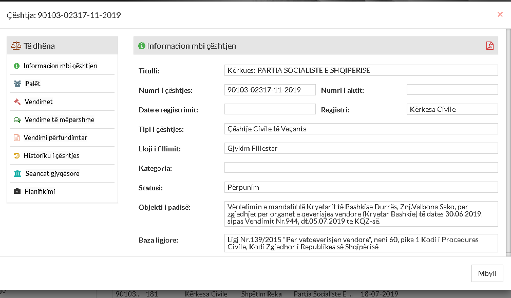 “Kërkuesi në rastin në shqyrtim është i ndryshëm nga ai në kërkesën e shqyrtuar në Vendimin dt.17 korrik 2019 të Gjykatës së Rrethit Gjyqësor Durrës, ku kërkuese ka qenë Valbona Sako, ndërsa në këtë gjykim kërkuese është Partia Socialiste e Shqipërisë; Shkaku ligjor i kërkimit është i ndryshëm, pasi në kërkesë subjekti politik Partia Socialiste e Shqipërisë ka bazuar kërkimin e saj në interesin e ligjshëm si pjesë e koalicionit zgjedhor, të cilit i përket kandidatja fituese për Kryetare e Bashkisë Durrës dhe interesit politik të këtij subjekti për fillimin e ushtrimit të mandatit nga kandidati fitues përkatës; Vendimi i Gjykatës së Rrethit Gjyqësor Durrës nuk ka marrë formë të prerë, provuar nga Vërtetimi i Kryekretarisë së Gjykatës së Rrethit Gjyqësor Durrës. Nga sa më sipër gjykata arrin në përfundimin se nuk ndodhemi në kushtet e „gjësë së gjykuar“ sipas nenit 451/a të K.Pr.Civile. Nga ana tjetër, neni 58 i K.Pr.Civile parashikon: „Kur në të njëjtën gjykatë ose gjykata të ndryshme shqyrtohen në të njëjtën kohë mosmarrëveshje midis të njëjtave palë dhe kanë të njëjtin shkak e të njëjtin objekt, vendoset pushimi i gjykimit të mosmarrëveshjeve të paraqitura pas asaj të regjistruar më parë”, thuhet në vendimin e dytë. Sipas gjyqtarit Reka për t’u ndodhur përpara „të njëjtës çështjeje“ (litispendenca) sipas këtij neni duhet të në të njëjtën gjykatë apo në gjykata të ndryshme të ndodhen për shqyrtim njëkohësisht dy ose më shumë çështje të cilat: – kanë të njëjtat palë; – kanë të njëjtin objekt kërkimi; – kanë të njëjtin shkak ligjor. Nëse këto kushte plotësohen njëherazi gjykata duhet të vendosë pushimin e gjykimit të çështjes/çështjeve të paraqitur(a) pas çështjes së parë. Mjafton një nga kushtet e mësipërme të mos përmbushet për të mos u ndodhur përpara „të njëjtës çështje në gjykim”.