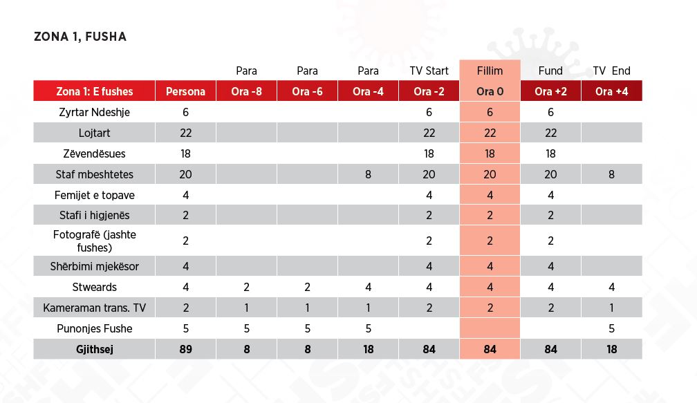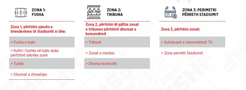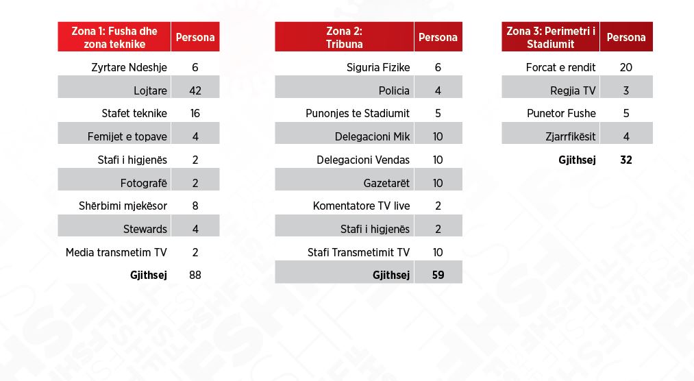 Sipasprotokollit të hartuar stadiumi do të jetë i ndarë në tre grupe personash sipas karakteristikave te aktivitetit që kryejnë (Zona): Grupi i kuq (Zona 1, Fusha) përbëhet nga lojtarët, trajnerët, stafi teknik dhe zyrtaret e ndeshjes. Grupi blu (Zona 2, Tribuna) përbëhet nga personat e transmetimeve TV, Stafi dhe Delegacionet e ekipeve dhe disa nga përfaqësues të tjerë të mediave. Ky grup mund të hyjë në stadium, por duhet të mbajë një distancë nga grupi i gjelbër (Zona 1). Grupi i verdhë (Zona 3, Përreth Stadiumit) përfshin persona të tjerë.