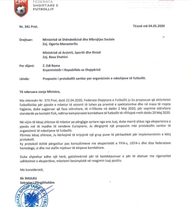 Me një letër zyrtare, Federata Shqiptare e Futbollit drejtuar dy ministrive, Ministrisë të Shëndetit dhe Ministrisë së Arsimit, Sportit dhe Rinisë, drejtuesit e futbollit në Shqipëri kanë bërë një tjetër përpjekje për të bindur autoritetet për rifillimin e kampionatit në Shqipëri.
