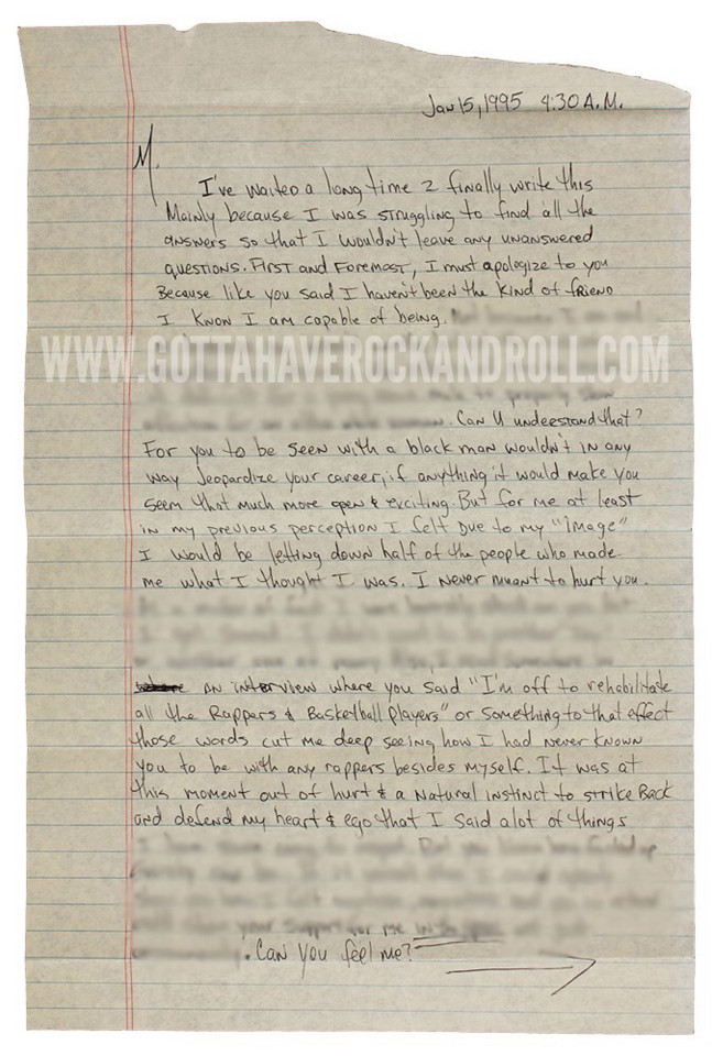 Në letrën me 3 faqe e cila daton në 15 qershor të vitit 1995, një vit para se ai të qëllohej për vdekje, Tupac i drejtohet Madonnës duke i kërkuar falje sepse nuk kishte qënë “lloji i mikut që unë e di që jam i aftë të jem”. Artistët dolën për pak kohë gjatë viteve 90, megjithëse e mbajtën sekret. Madonna tha në vitin 2015 se Shakur e kishte ngacmuar para një dalje të saj në televizor në vitin 1994, ndaj ajo u ndje “vërtetë gangstere” kur shau 13 herë në një emision live. Por ata e mbajtën lidhjen e tyre të fshehtë. Në letër, Shakur shkroi se ai nuk do ndihej mirë po të shihej me një grua të bardhë sepse “do ishte sikur të zhgënjente gjysmën e njerëzve që e bënë atë, atë që ai mendonte se ishte”, ndërsa të dilte me një burrë me ngjyrë do ndihmonte karrierën e saj. Ai shkroi gjithashtu se filloi të kishte dyshime ndaj saj kur tha se ishte detyra e saj “të rehabilitonte gjithë reperët dhe lojtarët e basketbollit”.