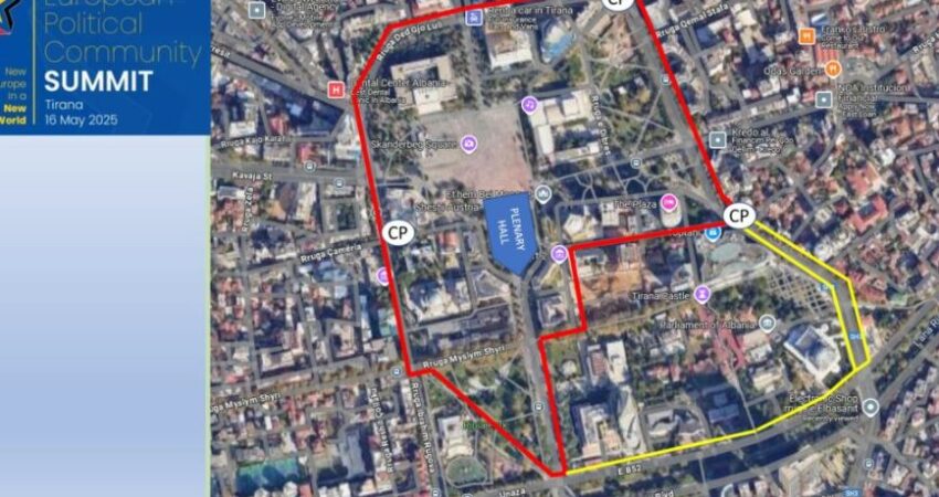 “Nga ora 06:00 – 18:00 të datës 16.05.2025, do të jetë i paaksesueshem nga këmbësorë dhe mjete, i gjithë perimetri i sheshit ku do të zhvillohet aktiviteti, perimetër i cili përfshin rrugët: Nga kryqëzimi me bulevardin “Zhan d’Ark” deri në kryqëzimin e rrugës “Myslym Shyri”, segmentin e rrugës “Myslym Shyri” nga kryqëzimi me rrugën “Ibrahim Rrugova” deri në kryqëzimin me bulevardin “Dëshmorët e Kombi”, rrugën “Ibrahim Rrugova” nga kryqëzimi me rrugën “Myslym Shyri” deri në kryqëzimin me rrugën e Kavajës, rrugën “Ded Gjo Luli”, rrugën “Urani Pano” në vazhdim rrugën e Barrikadave deri në kryqëzimin me rrugën “George Ë. Bush” dhe bulevardi “Zogu i I” deri te tuneli i “ish-Cirkut”.