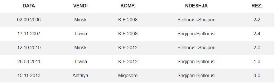 Me Bjellorusinë jemi ndeshur 5 herë, me statistikat që anojnë nga ana e bjellorusëve. Për herë të parë jemi përballë në eliminatoret e Euro 2008. Shqipëria që atëherë drejtohej nga kroati Otto Baric, ndeshjen e parë barazoi 2-2 jashtë, ndërsa ndeshjen e kthimit humbi 2-4, rezultat që shkaktoi polemika të mëdha në ambientet e sportit dhe jo vetëm.