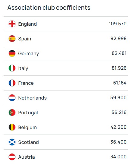 Megjithatë, në përgjithësi, Anglia, Spanja, Gjermania, Italia dhe Franca ende përbëjnë pesëshen e parë në UEFA.