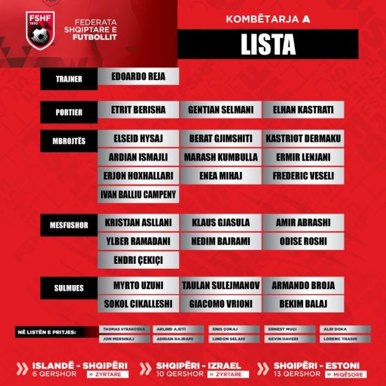 Gazeta Si – Trajneri i Kombëtares ka shpallur listën e lojtarëve të grumbulluar për 3 ndeshjet e qershorit. Shqipëria luan me Islandën më 6 qershor, Izraelin më 10 qershor dhe Estoninë më 13 qershor. Lista e Rejës ka disa surpriza.