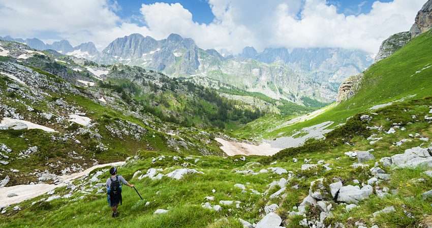Pasi një nate të kaluar në Theth, guida shqiptare më çon drejt Luginës së Valbonës nëpër një kalim shkëmbor.