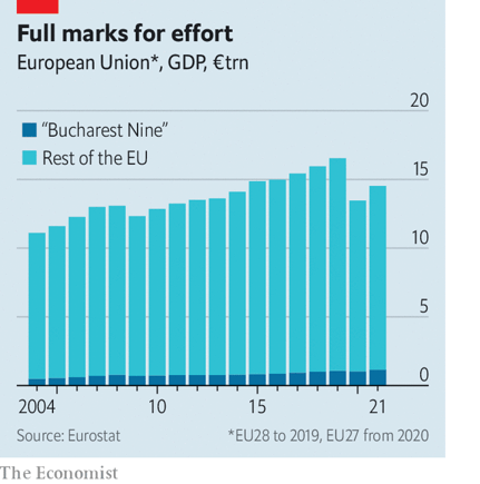 Pesha ekonomike e grupit ka ardhur në rritje, me standardet e jetesës duke mbyllur gradualisht hendekun me Europën Perëndimore. Nevoja që Europa të riatdhesojë disa zinxhirë furnizimi nga Kina mund t’i japë asaj peshë të mëtejshme. Por mungesa e integrimit financiar – Polonia nuk është në euro – e kufizon disi ndikimin e saj edhe atje. Dhe të nëntë vendet e Bukureshtit marrin më shumë nga buxheti i BE-së sesa paguajnë. Në praktikë, kjo ul ndikimin e tyre.