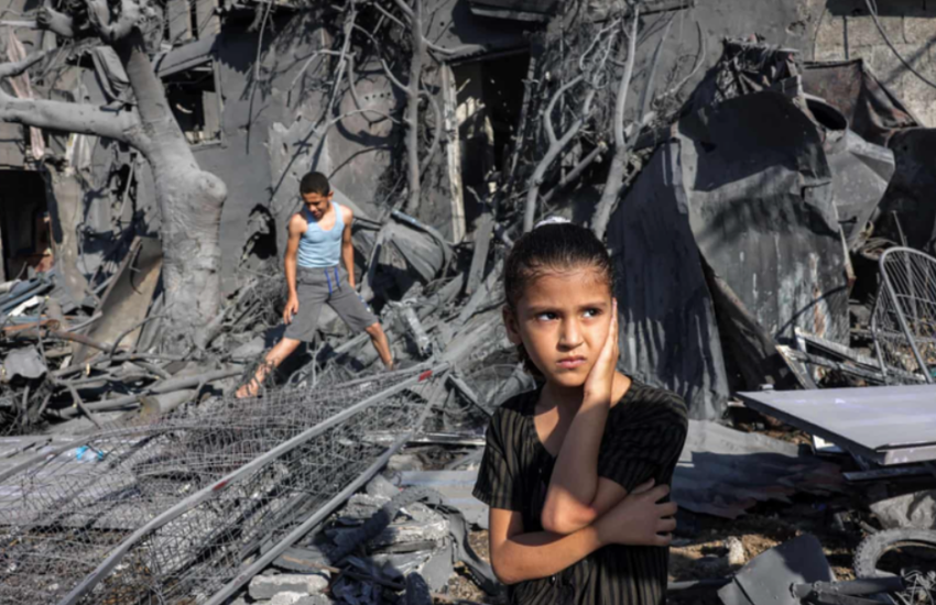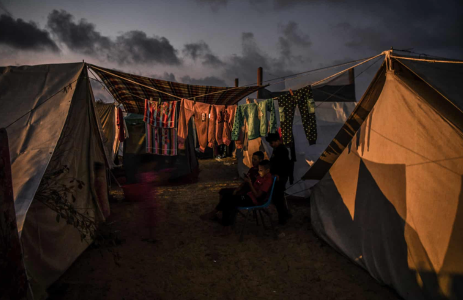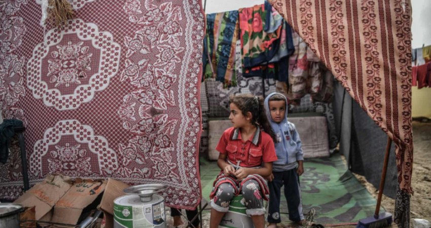 Dy fëmijë qëndrojnë një një tendë të improvizuar. Familjet palestineze vijojnë të jetojnë në kushte shumë të vështira, pasi shtëpitë e tyre u shkatërruan gjatë sulmeve izraelite në Khan Yunis.