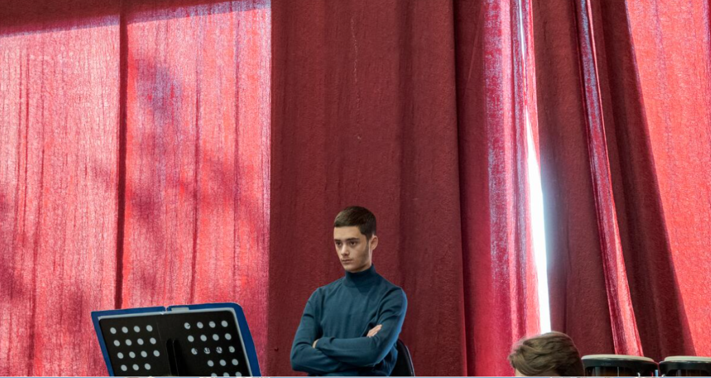 Ndërsa fotografia tjetër tregon një muzikant që përgatitet për shfaqjen inauguruese të Operës së Kosovës në Pallatin e Rinisë dhe Sporteve.