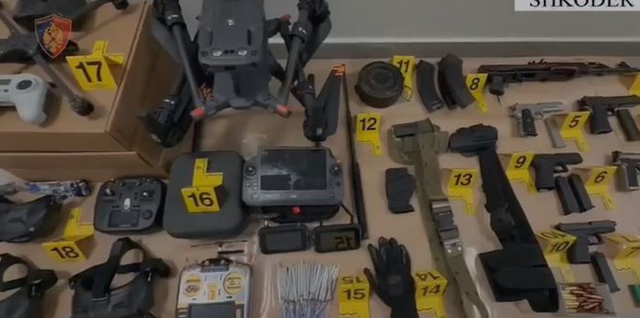 Në njoftimin për mediat këtë të martë, thuhet se u sekuestrua 1 automatik, 6 pistoleta, fishekë, 45 kapsolla detonatorë, një makinë tip “Audi” me targa të vjedhura në Lezhë, 5 dronë dhe 5 aparate fotografike.