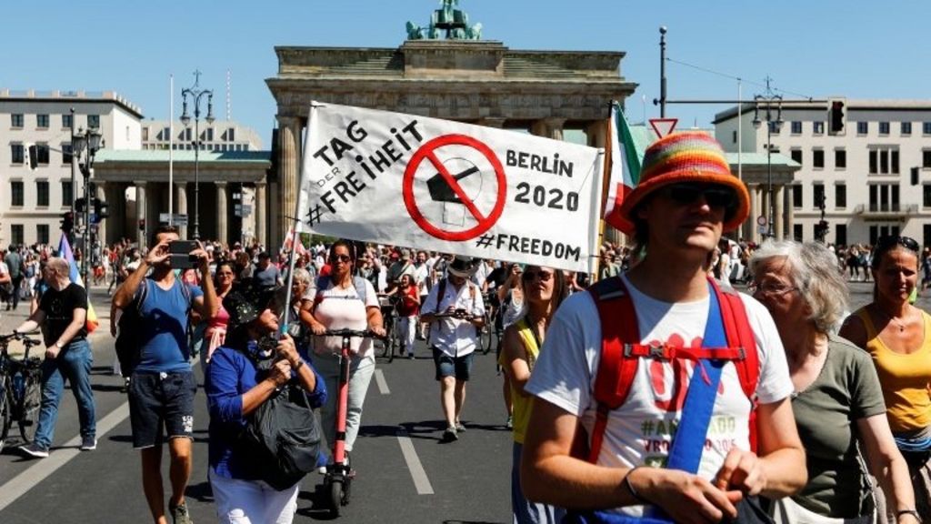 “Po mbi ç’ligj detyrohen të moshuarit të vdesin nga vetmia? Mbi ç’ligj ndalohen mbledhjet familjare?, protestonte një prej organizatoreve të protestave në Paris. Me mijëra në kryeqytetin gjerman, Berlin protestuan në fund të gushtit kundër shtrëngimeve të masave ndaj koronavirusit, ku përfshihet detyrimi për ta mbajtur maskën në mjedise të hapura publike dhe ku ndalohet grumbullimi mbi 50 vetë. Sipas demonstruesve mbajtja e maskave dhunon të drejtat dhe liritë e tyre.