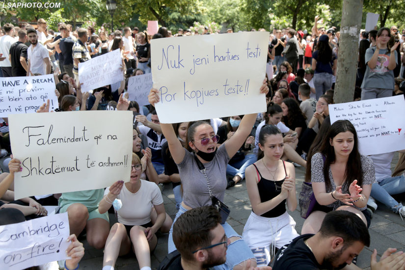 Studente te viteve te treta (maturante), te shkollave te mesme duke protestuar prane Qendres se Sherbimeve Arsimore, QSHA, pas provimit te trete te Matures Shteterore, ate te matematikes, te cilin e konsiderojne shume te veshtire. Ata thane se pyetjet ishin marre nga interneti ndersa kerkojne uljen e pragut te pikeve dhe rivleresim.