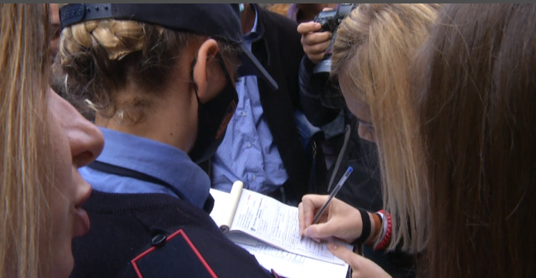 Efektivët kanë kërkuar shpërndarjen e turmës, teksa kanë kërcënuar Kryemadhin për vendosje gjobe si pasojë e mosmbajtjes së maskës në ambiente publike.