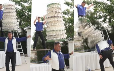 Një banor i Qipros vuri në provë një aftësi që e ka ushtruar për gati 30 vjet duke balancuar 319 gota vere në kokën e tij dhe duke thyer një rekord botëror.